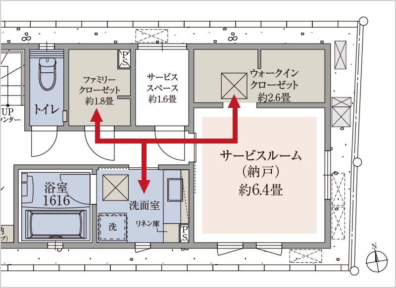 - ガス乾燥機を標準装備した洗面室と大型収納を配置。家事を1ヶ所でまとめて完結しやすい家事楽時誕プラン。