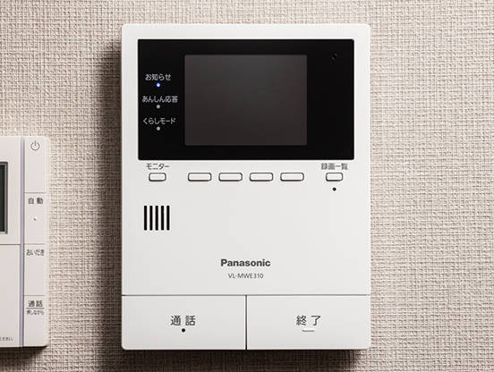 STAGE1- LDに設置されたエントランスモニターは自動録画機能はもちろん、玄関ドアの施解錠機能付き。家族の帰宅時などでもLDにいながら鍵の開け閉めが可能です。