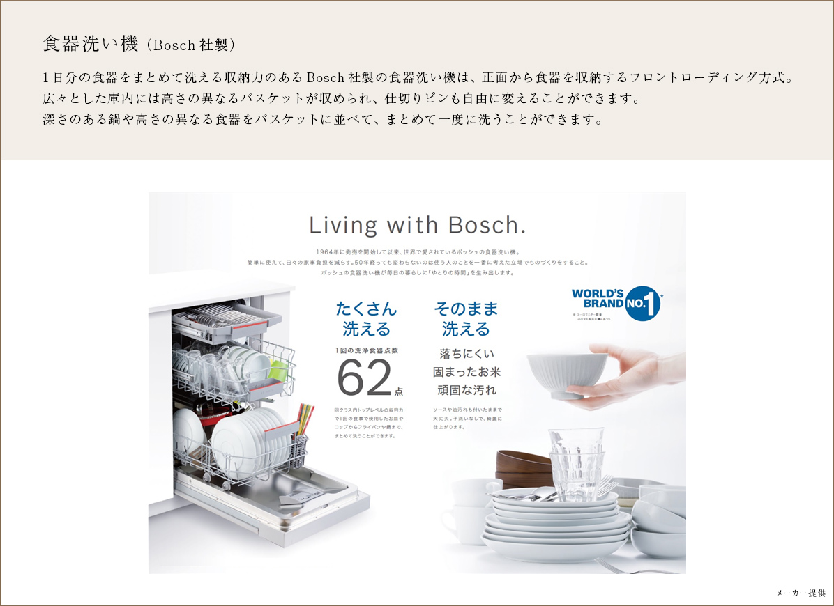 STAGE2- ドイツ発祥の上質なビルトイン家電ブランド「Bosch」の大型フロントフルオープンタイプを装備。腰を深くかがめることなく、楽な姿勢で食器を出し入れできる仕様です。