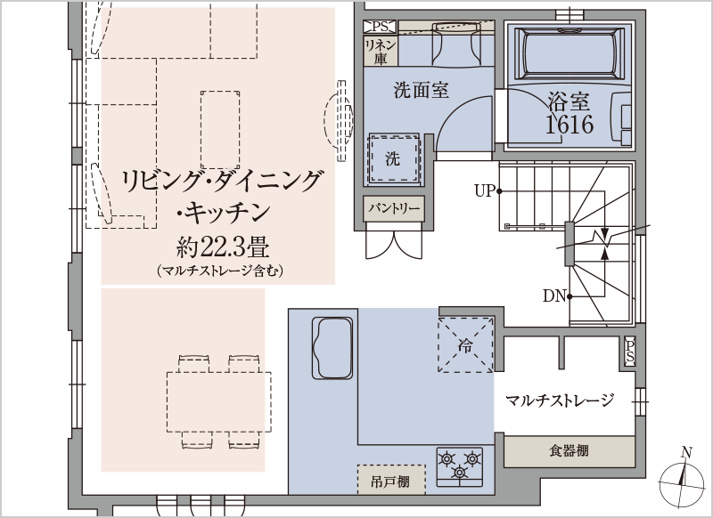 - 水回り集中に加えてキッチンと洗面の間にパントリーを設置(STAGE3はウォークインパントリー採用)。