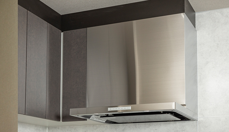 - レンジフードは、スタイリッシュなステンレスシルバーを採用。整流板がついているため換気効果が高まり、また油汚れなどのお手入れも簡単です。