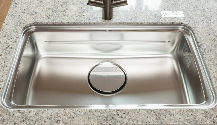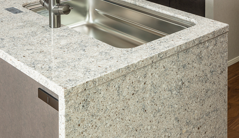 - 約90%が天然の水晶からなるフィオレストーンをキッチン天板に使用。天然石の風合いを持ちながら、自然素材の欠点であるもろさや汚れの染み込みを克服しています。クォーツが持つ独特の立体感と手触り、質感と光沢が魅力の素材です。