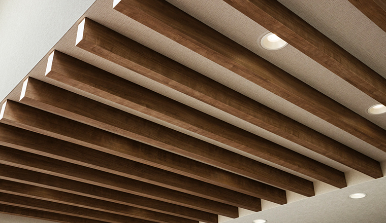 - 優しい色、心に迫る豊かな木目が印象的な、朝日ウッドテック社「tha wall」の突板素材を天井に採用。間接照明との調和により、落ち着いた空間を演出します。