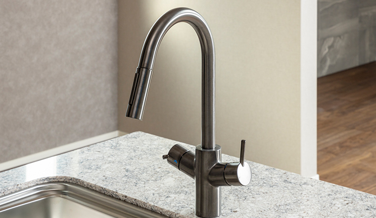- 機能美を追求するドイツの老舗水栓金具メーカー「ハンスグローエ」と、水にこだわる日本の浄水器メーカー「メイスイ」のコラボレーションによって生まれたキッチン水栓。美味しい水をつくる浄水器を内蔵しながら、美しいデザインを実現しました。