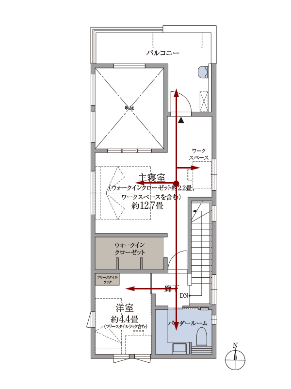 水回り・キッチンを集約することで家事動線を追求した《ワンフロア家事完結プラン》* ウォークインパントリー約2.4畳を含む - 3F12畳超*の主寝室には、ワークスペース、そして大容量のウォークインクローゼットを配置。