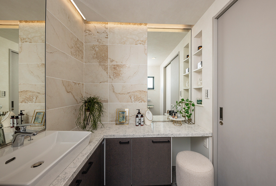 - 洗面化粧台にもキッチン同様にフィオレストーンを採用。水回りを美しく演出。
