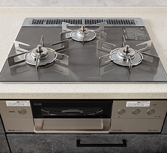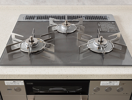 STAGE3- キッチンには、見た目が美しいだけでなく、掃除も容易なガラストップのガスコンロを採用しています。