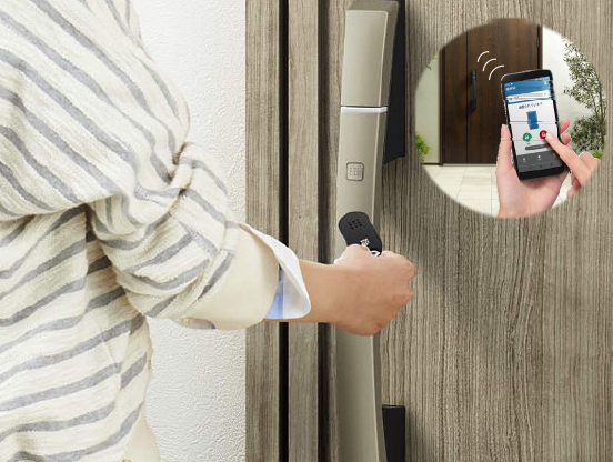参考写真- タグキーを近づけるだけで上下2つのカギを1度に開閉することが可能です。アプリとの連携でスマートフォンでも施解錠の操作ができます。