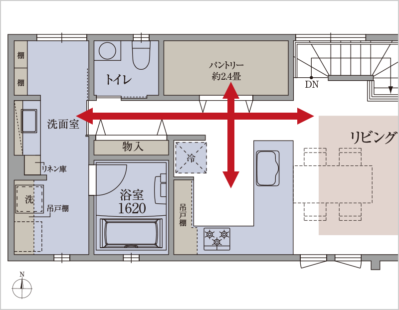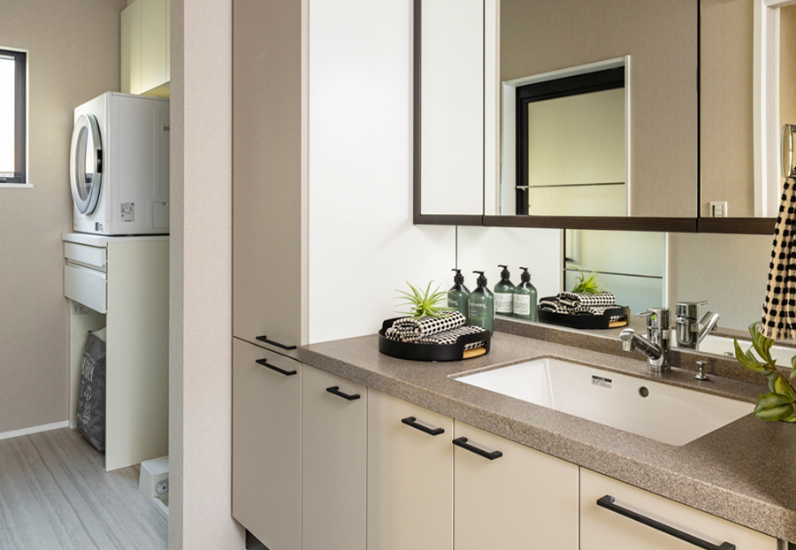 - ガス乾燥機を標準装備した洗面室と大型収納を配置。家事を1ヶ所でまとめて完結しやすい家事楽時誕プラン。