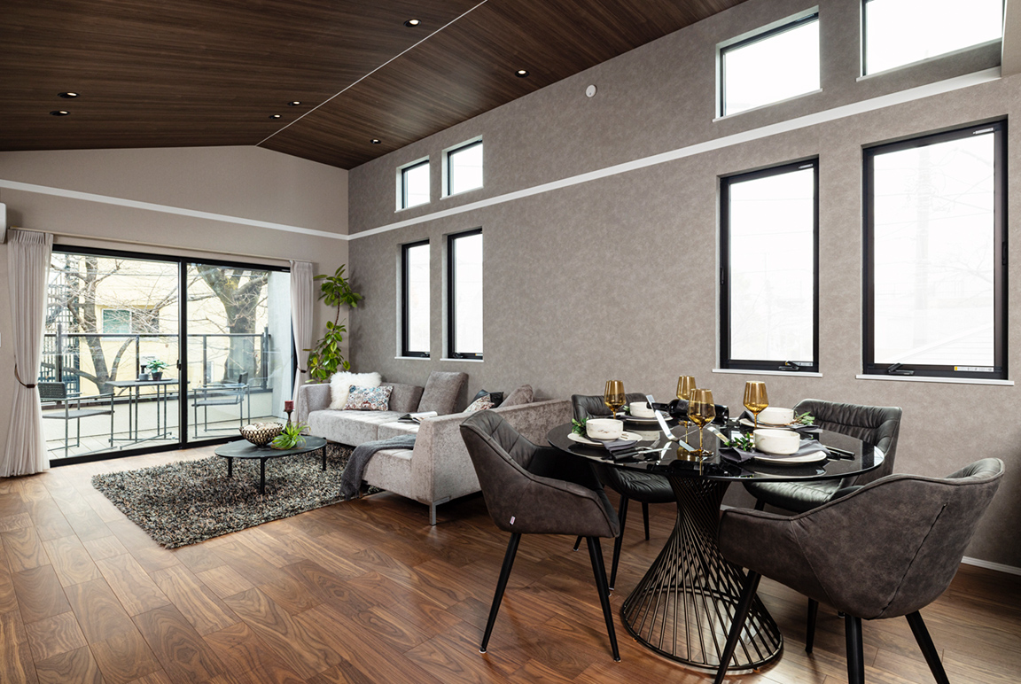 LDK天井は木調デザインと間接照明を採用し、家族が集まるリビングを暖かな空間に。