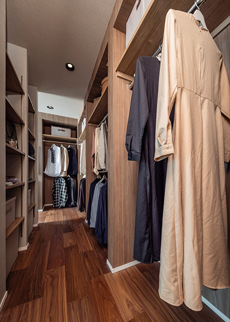 ゆとりあるウォークインクローゼットには、ご夫婦の衣類以外にもシーズンオフの寝具なども収納可能。