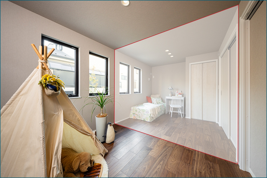 家族の変化に対応する可変性のある空間。 家族が増え、お子様の成長とともに自室が必要となった場合には、フリーウォールの設置で2つに分けることが可能な2in1ルーム。