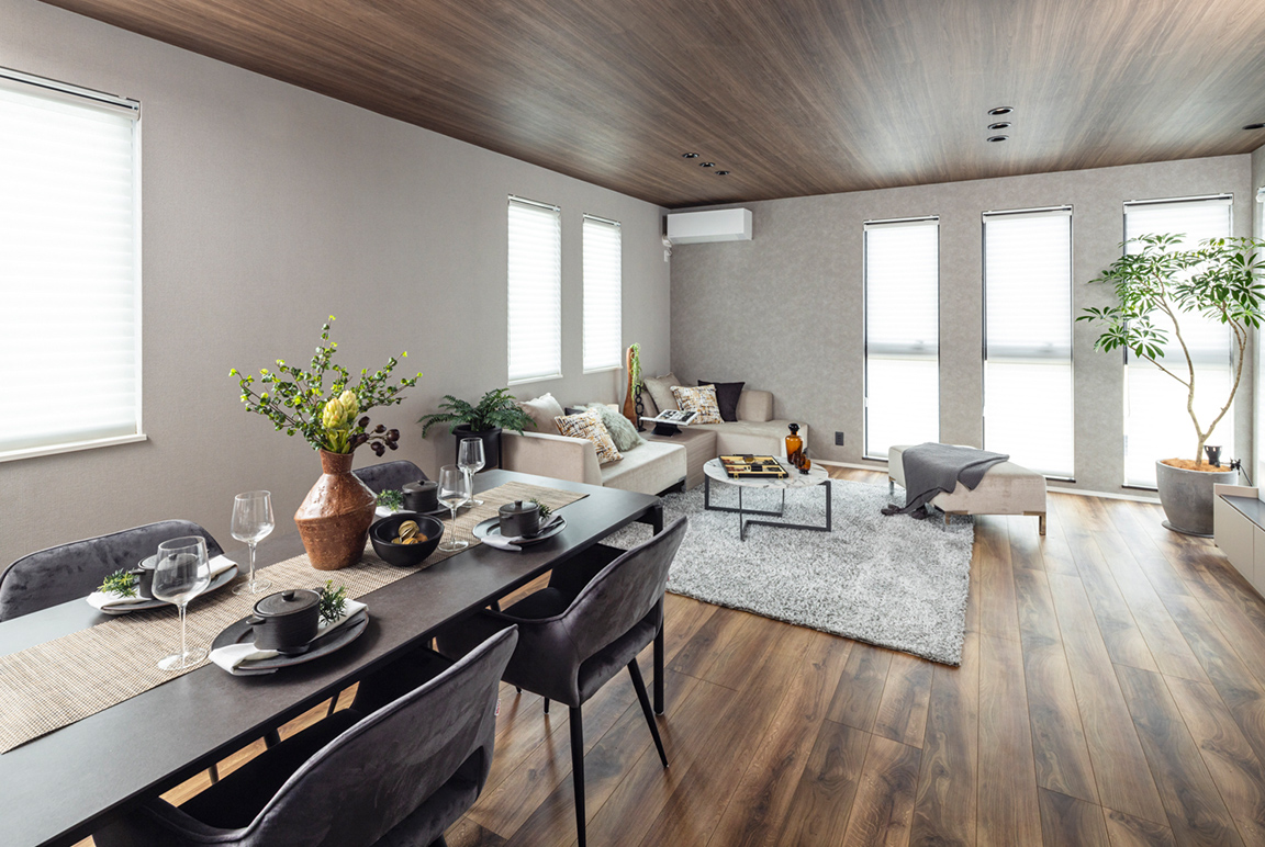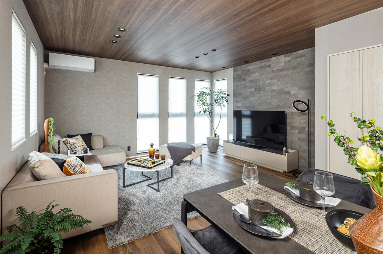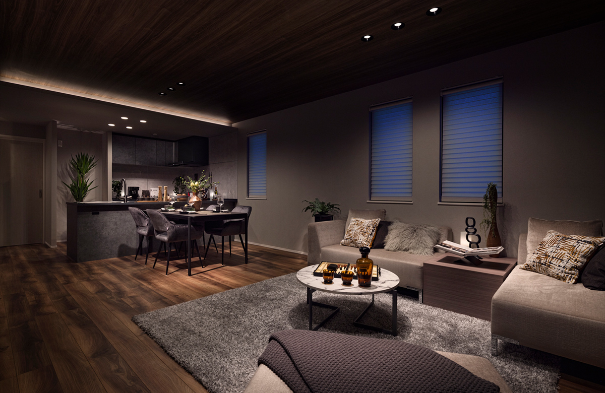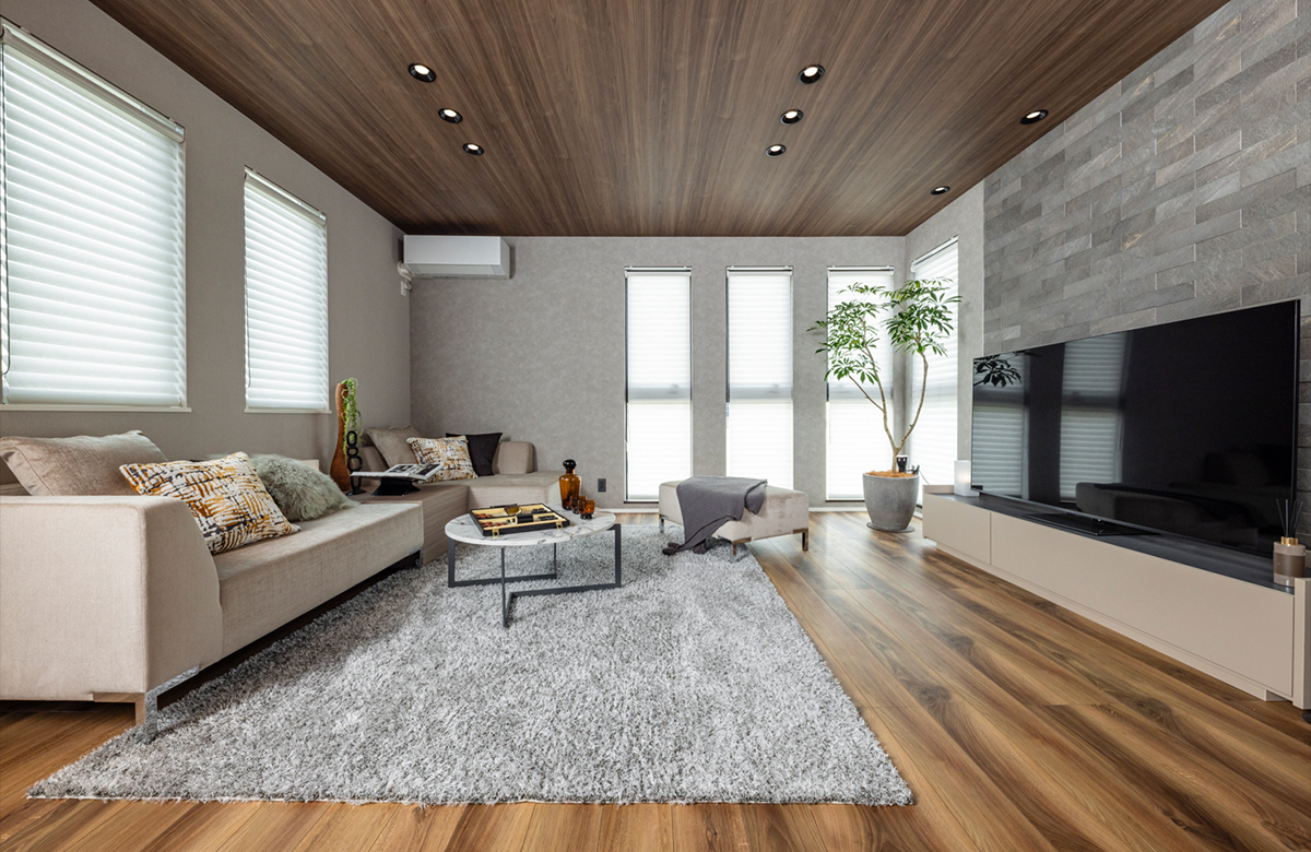 LDK天井は木調デザインと間接照明を採用し、家族が集まるリビングを暖かな空間に。