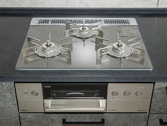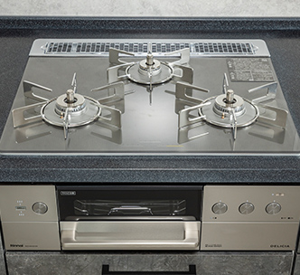 STAGE2- キッチンには、見た目が美しいだけでなく、掃除も容易なガラストップのガスコンロを採用しています。