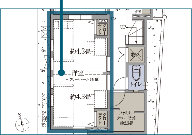 ※フリーウォール:壁を設置することで2部屋に分けて使用することも可能です。現状壁は未設置となります。設置依頼、ご費用負担はお客様にてお願いいたします。