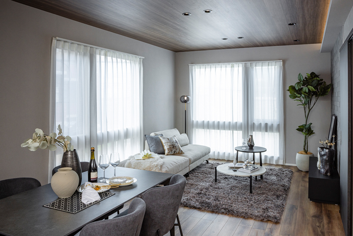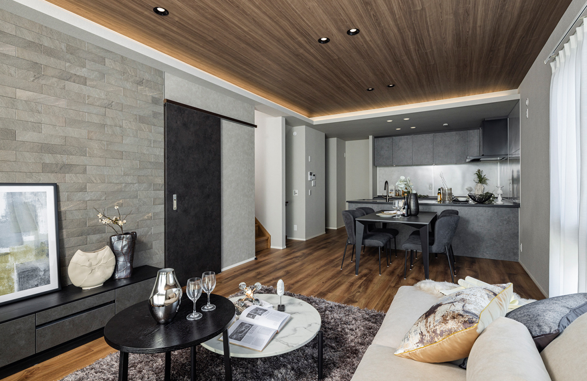 LDK天井は木調デザインと間接照明を採用し、家族が集まるリビングを暖かな空間に。