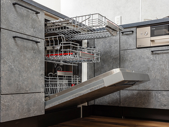 STAGE2- ドイツ発祥の上質なビルトイン家電ブランド「Bosch」の大型フロントフルオープンタイプを装備。腰を深くかがめることなく、楽な姿勢で食器を出し入れできる仕様です。