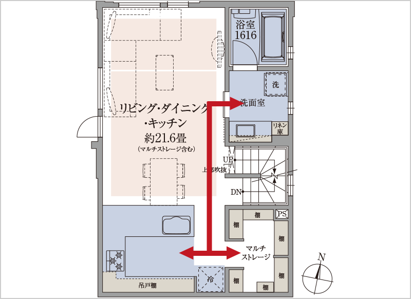 - 2階に水回り集中に加えてキッチン横にマルチストレージを配置。〈洗う・乾かす・しまう〉が完結する家事楽時誕プラン。