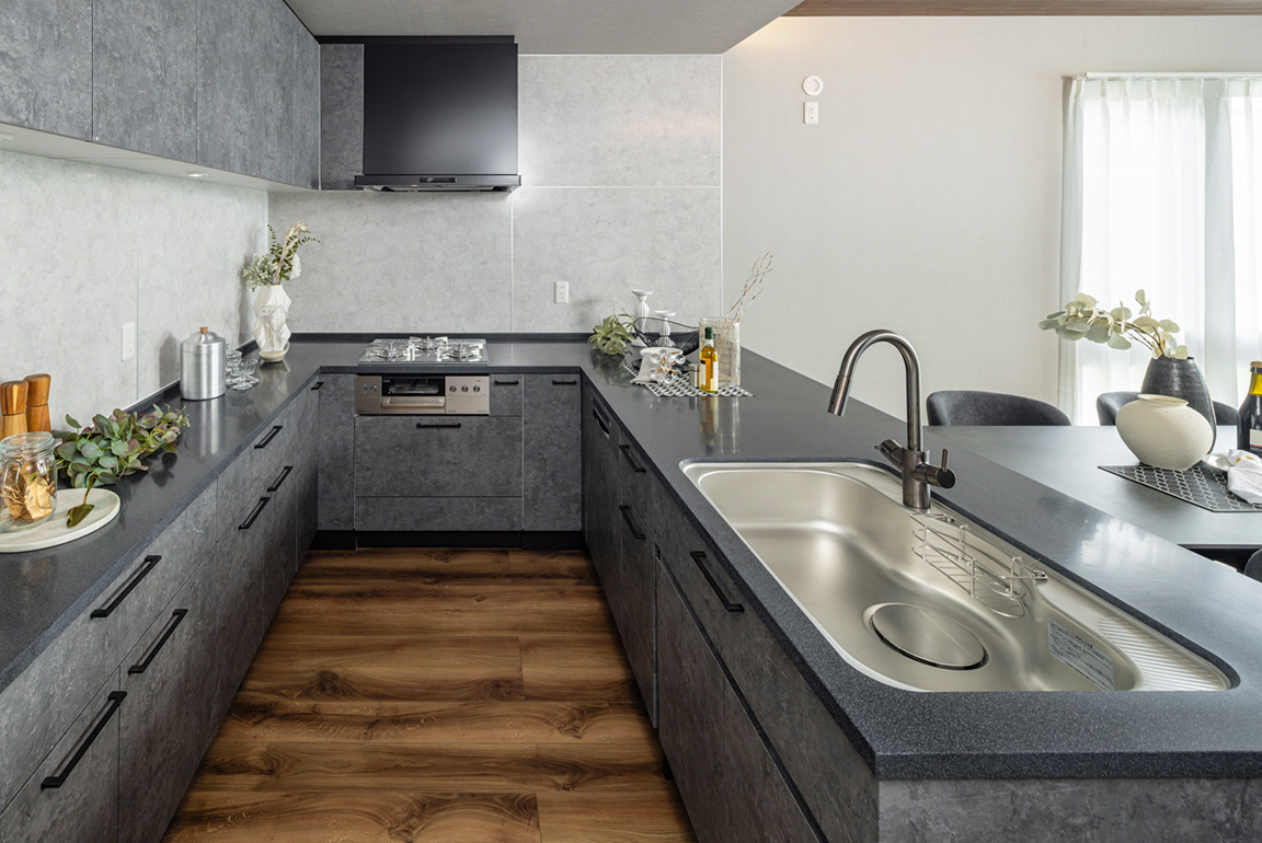 ご夫婦やお子様と一緒に家事シェア可能な大きなキッチン。
